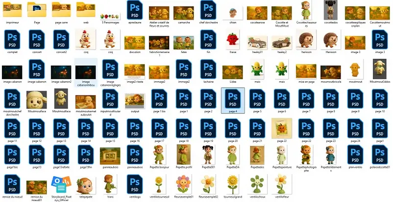 Une toute petite partie des fichiers Pixatoys…, vous ne voyez qu’une partie du bazar organisé. Derrière chaque image, il y a dix versions, trois cafés, et un MoutMout qui surveille la lumière.” 😄